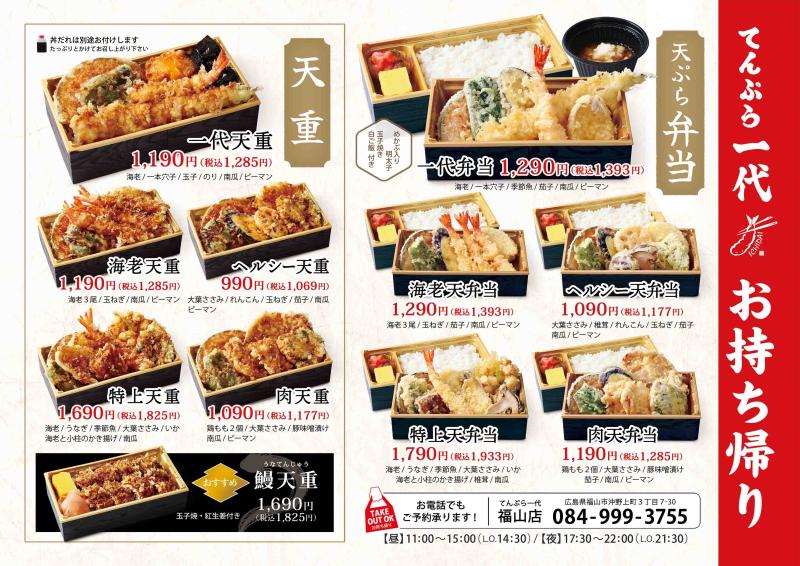 てんぷら 一代 福山店 広島県沖野上町3丁目7-30 11:00~15:00 / 17:30~22:00 L.O. 14:30 / 21:30 不定休 TEL. 084-999-3755 公式LINEUber Eatsインスタグラム